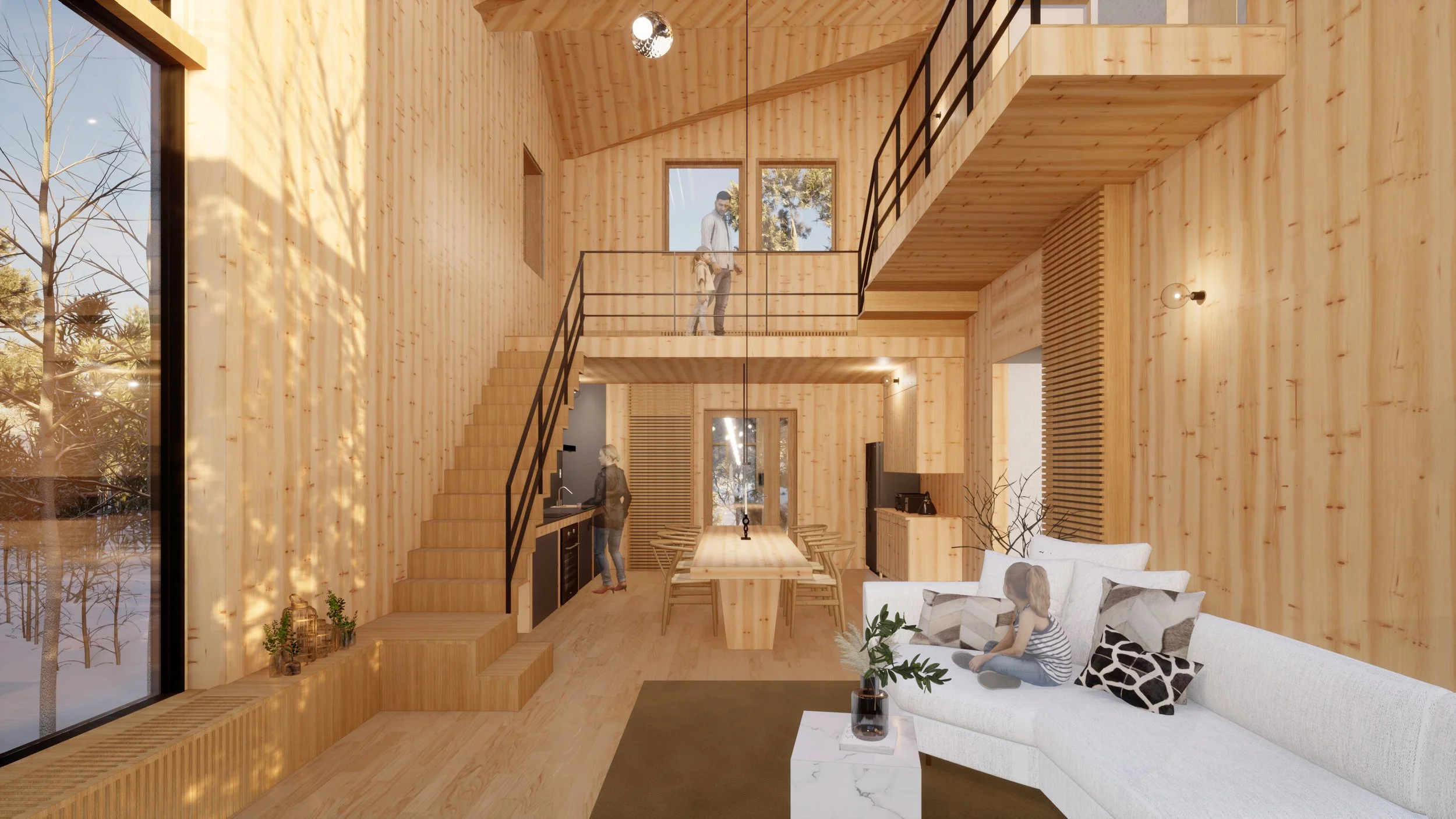 北海道留虻田郡寿都村、尻別岳の麓に建つ、小さな宿泊施設の計画である。敷地は南側が国道に面し、北側に向かって緩やかな斜面となっている。建物の構成は、1階がガレージとエントランス、リビング・ダイニング・キッチン、バンクベッド付の宿泊室、中2階に書斎、2階は4部屋の宿泊室となっている。南側国道からの騒音と視線を避けるため、リビングダイニングを北側に配置し、ルスツリゾートへ視線の抜ける西側と、尻別岳を望む北側を大きな開口部としている。